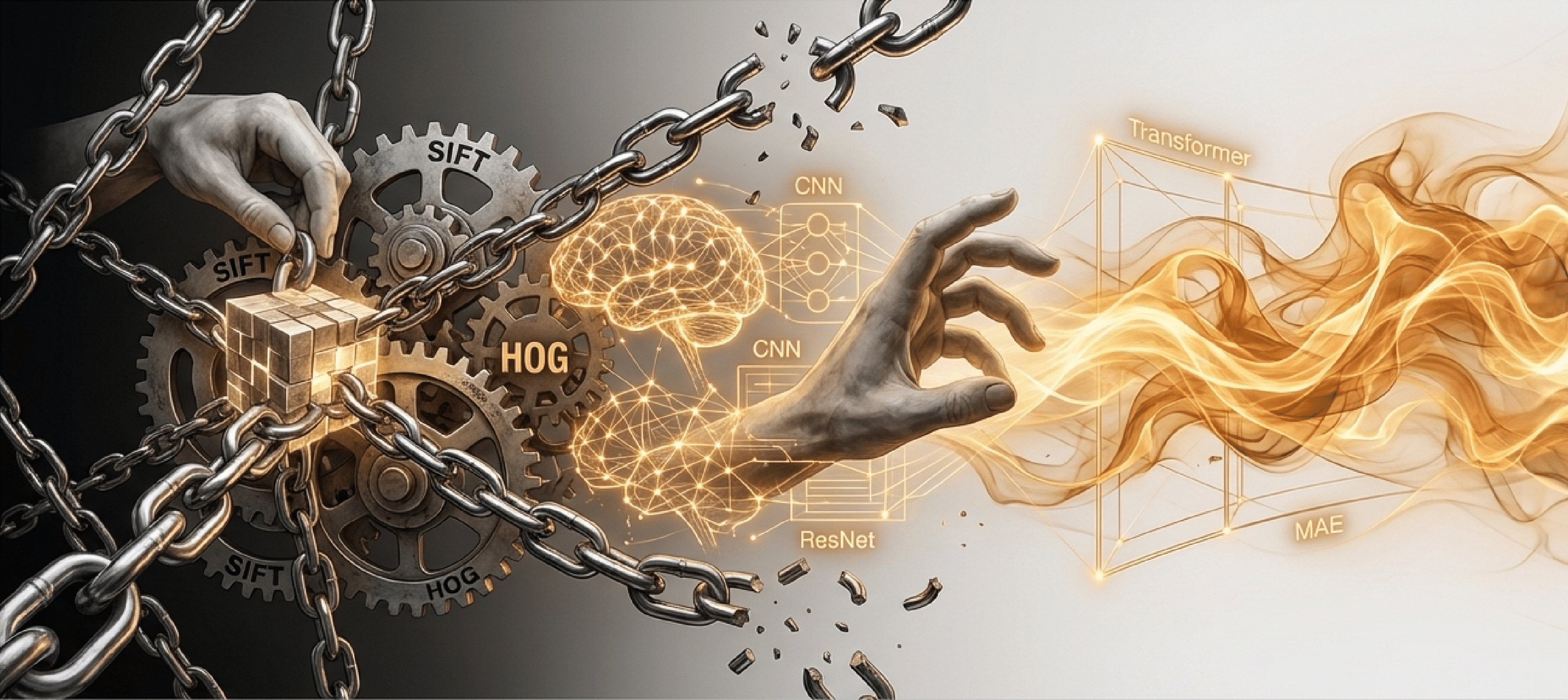 - Hand-crafted Features (SIFT/HOG): In the beginning, humans told machines what to see. We manually defined features—edges, corners, gradients—essentially dictating the vocabulary of visual understanding.