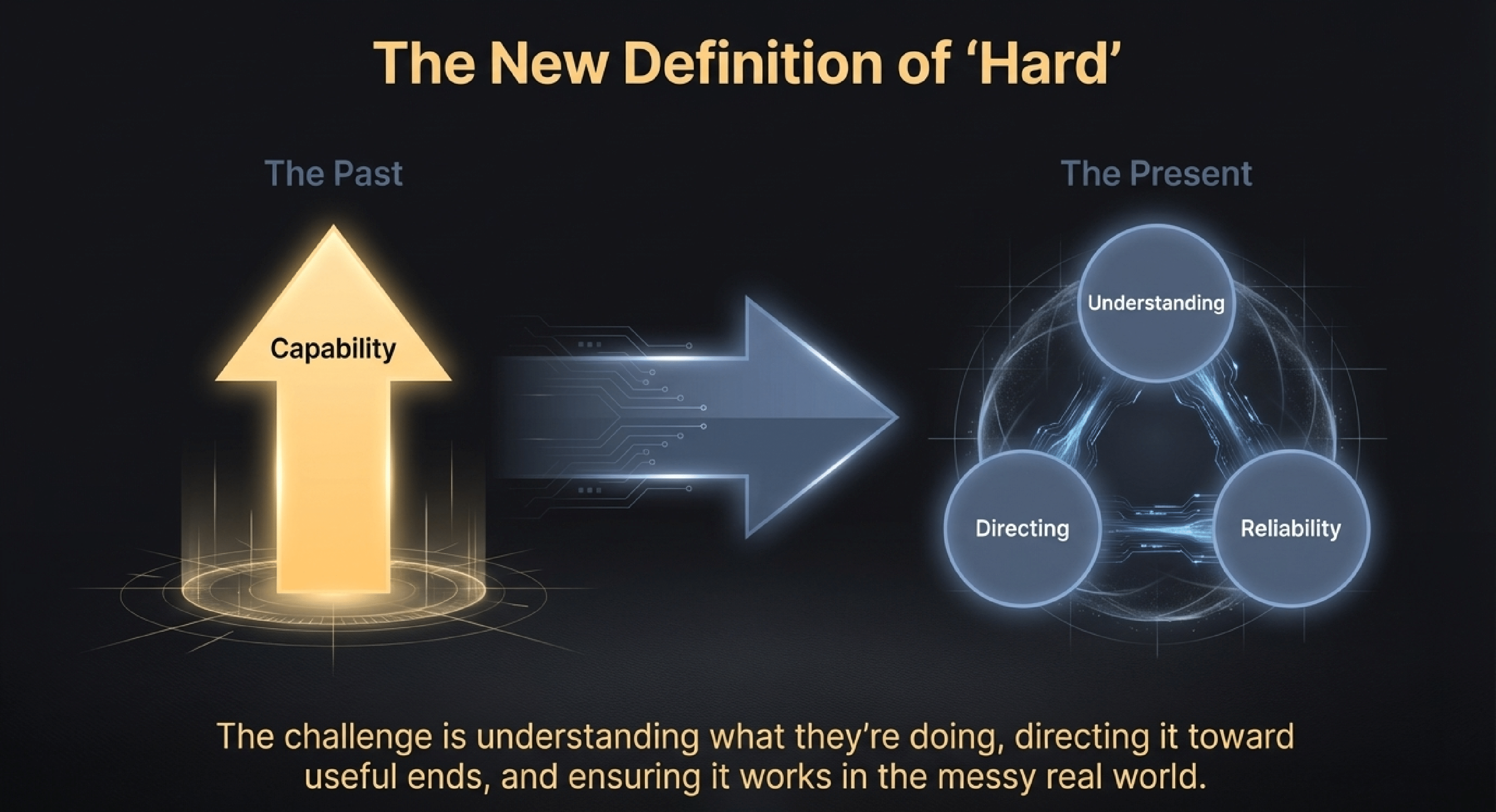 The thread connecting all of this is a shift in what “hard” means. For decades, the challenge was getting AI systems to do anything at all. Now the challenge is understanding what they’re doing, directing it toward useful ends, and ensuring it works reliably in the messy real world.
