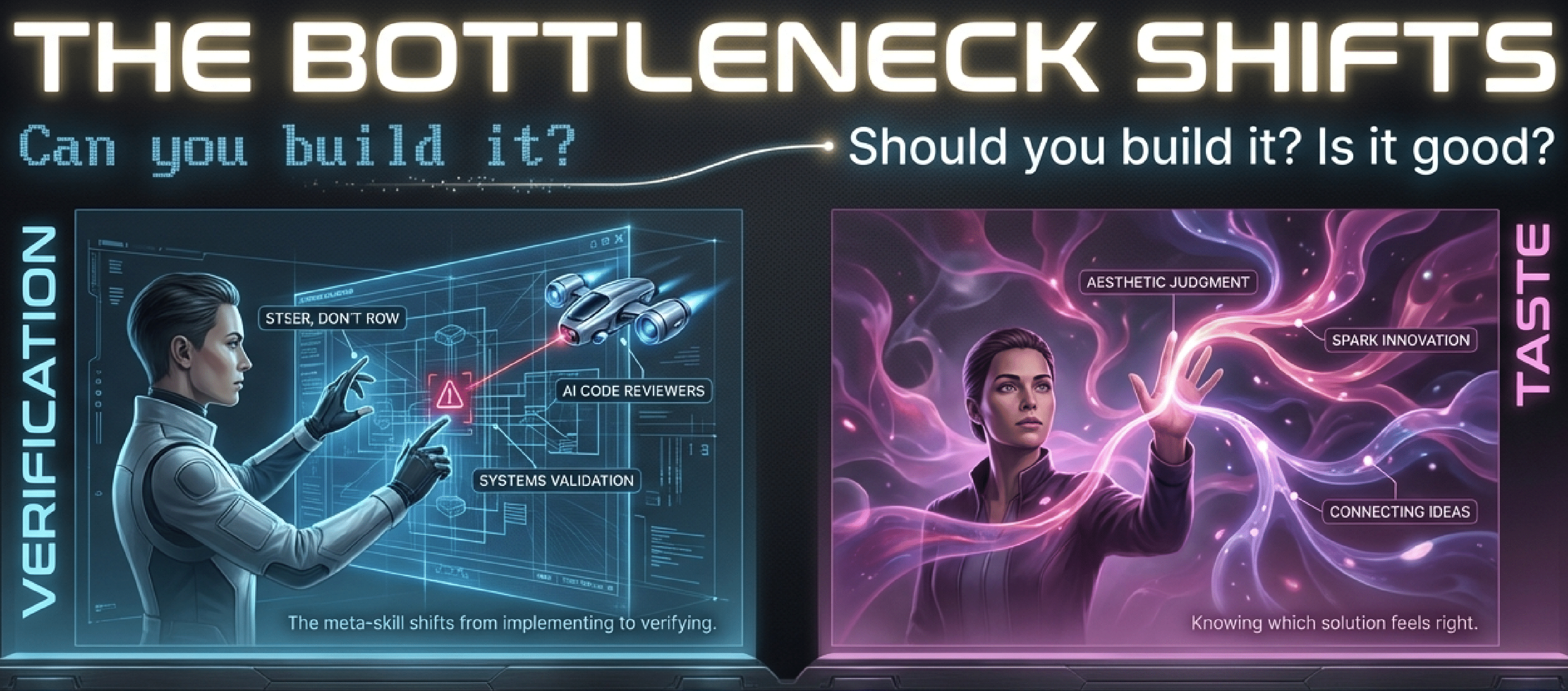 This is what sets the ceiling. The bottleneck has shifted from “can you build it?” to “should you build it, and is it good?”